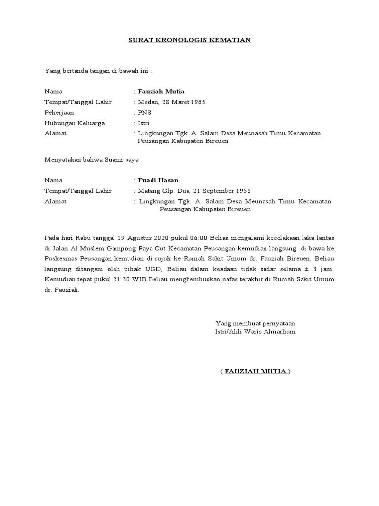 Berikut ini contoh surat kronologis kematian.